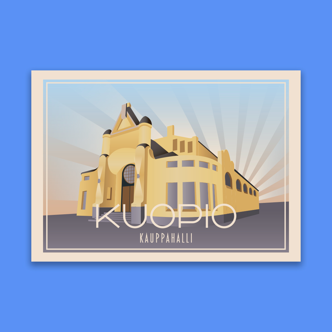 Art deco-henkinen postikorttisarja Kuopiosta. Kuvitukset toteutettu vektorikuvituksena Illustratorilla. Kuvitusten pohjalla on käytetty valokuvia ja kuviin on luotu tunnelmaa harkituin värein ja yksityiskohdin.